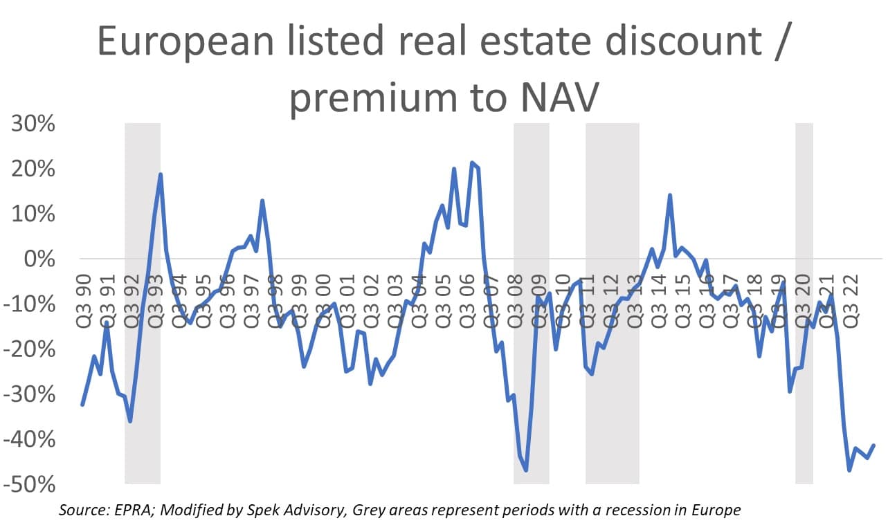 Last year, we published a blog detailing the relationship between public and private real estate through the discount to NAV (Net Asset Value) metric. This metric emerged as a reliable indicator of relative performance. A higher discount suggests that public real estate may outperform private real estate in the coming five years.